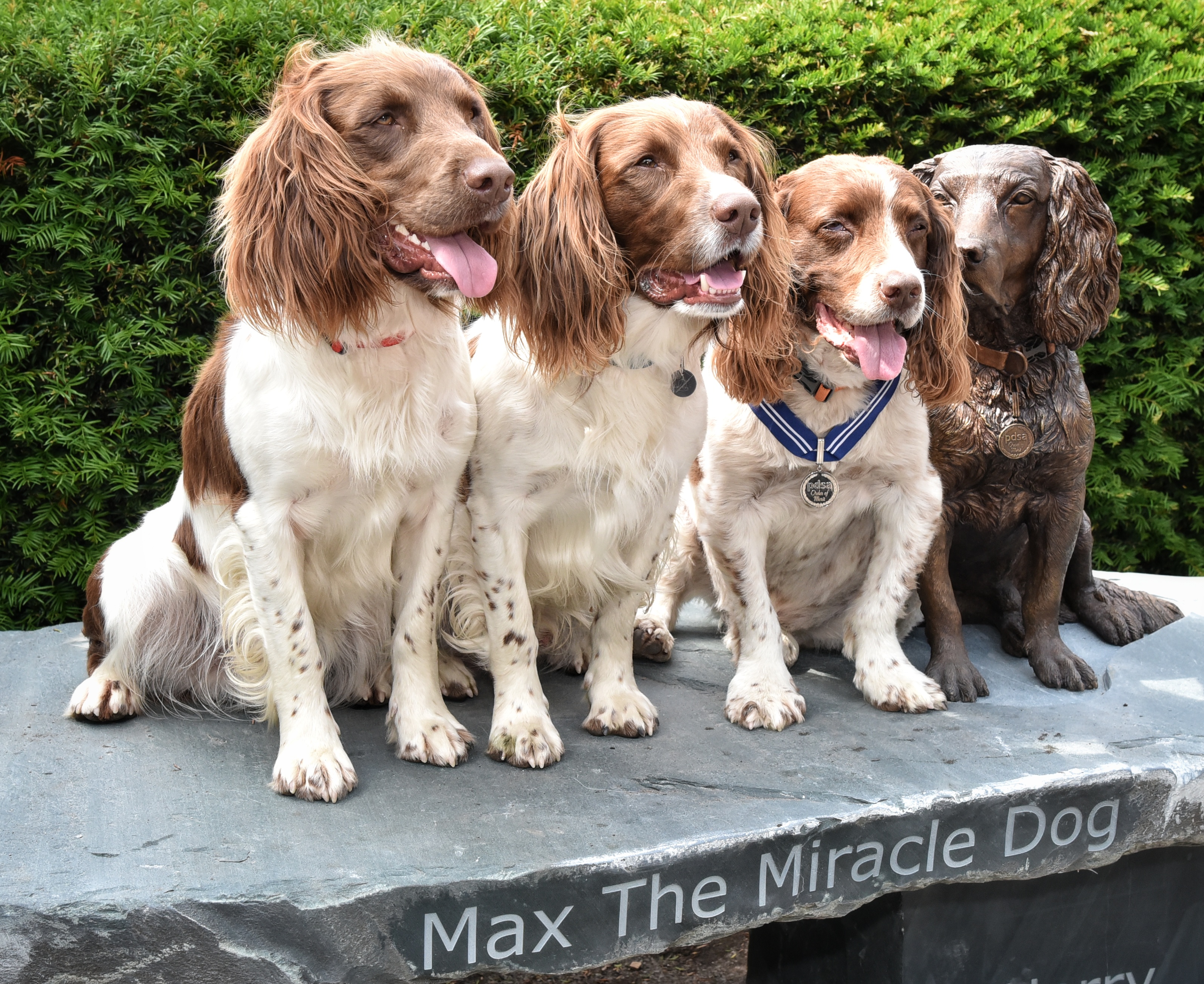 l-r Harry, Paddy and Max next to the new bronze statue of Max, wearing his PDSA Order of Merit.