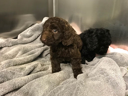 Two Cockapoo puppies who were found dumped in a cage and huddled asleep on top of the bodies of their dead siblings have had their lives turned around after being rescued.