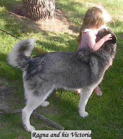 Very gentle animals, our daughter is 2yrs in this photo and see how he is trying to make sure she can steady herself with his body on the uneven terrane of the family farm! Huskies quickly become a child's best friend, however it is important also to be sure that Huskies understand that the children are their bosses and not their equals or lessers.