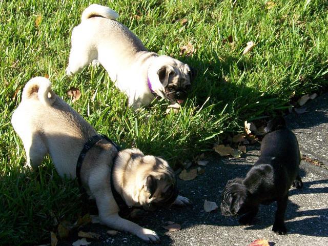 He's a great snuffing, snorting, snorer. Spins when he's happy and wants to spend all day taking over mom's lap. Loves to get crazy with sister and the newest neighbor. Pogo's in the black harness. We're glad he picked us.