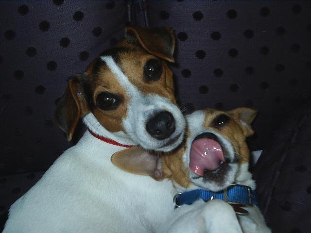 They are from the same litter, and Leah is the runt. Even though she is the runt, she is the boss! lol. She is the brown and white one. Jackie is the black, brown and white one.