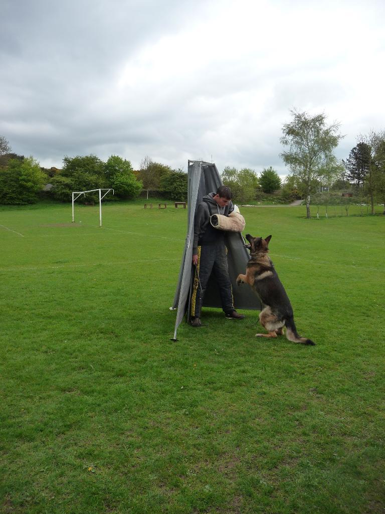 A dog waits to bite the Schutzhund sleeve.