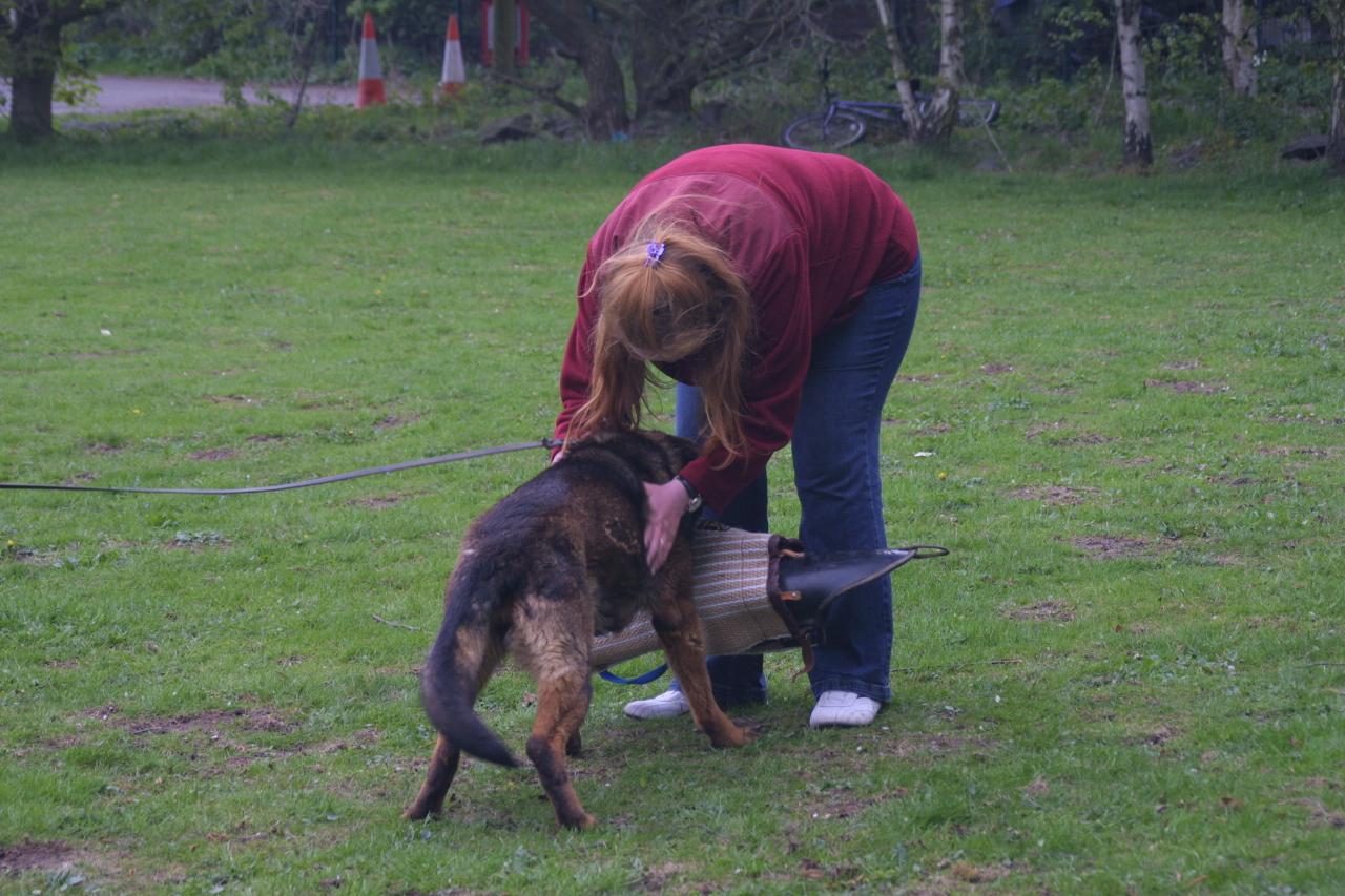 Julie and Susie have a cuddle to celebrate Susie winning the tug of war with the Schutzhund sleeve.