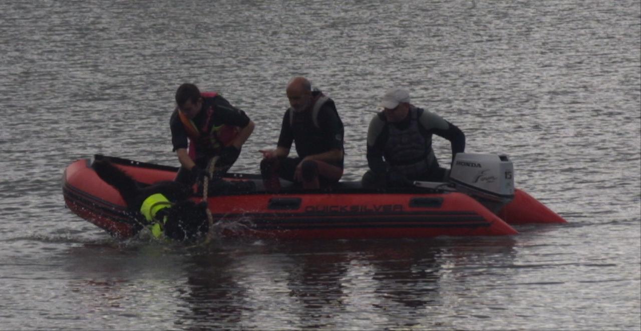 The Newfoundlands jump from a boat into the water and then tow the boat back to shore.