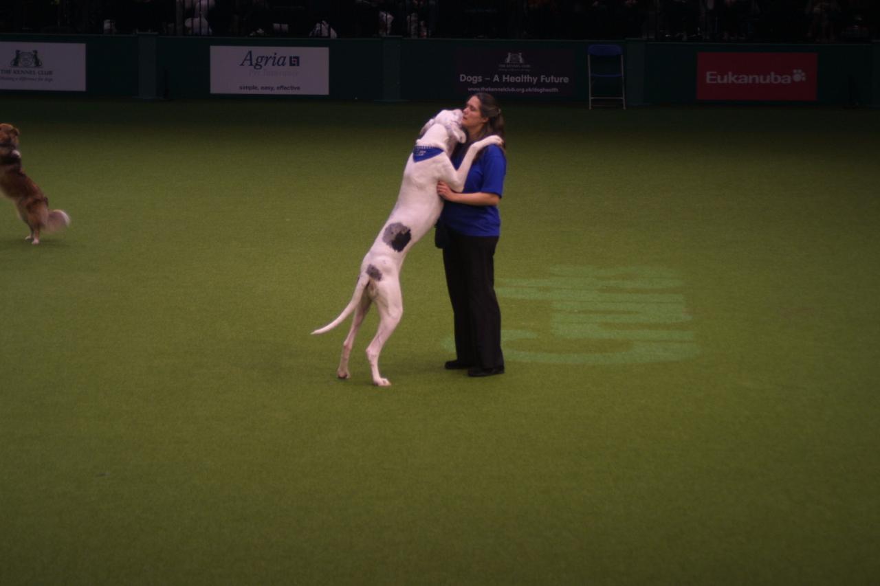 Just one of the moves you can do with a Great Dane in heelwork to music - paws on shoulders! Ruach and Christina Oxtoby.