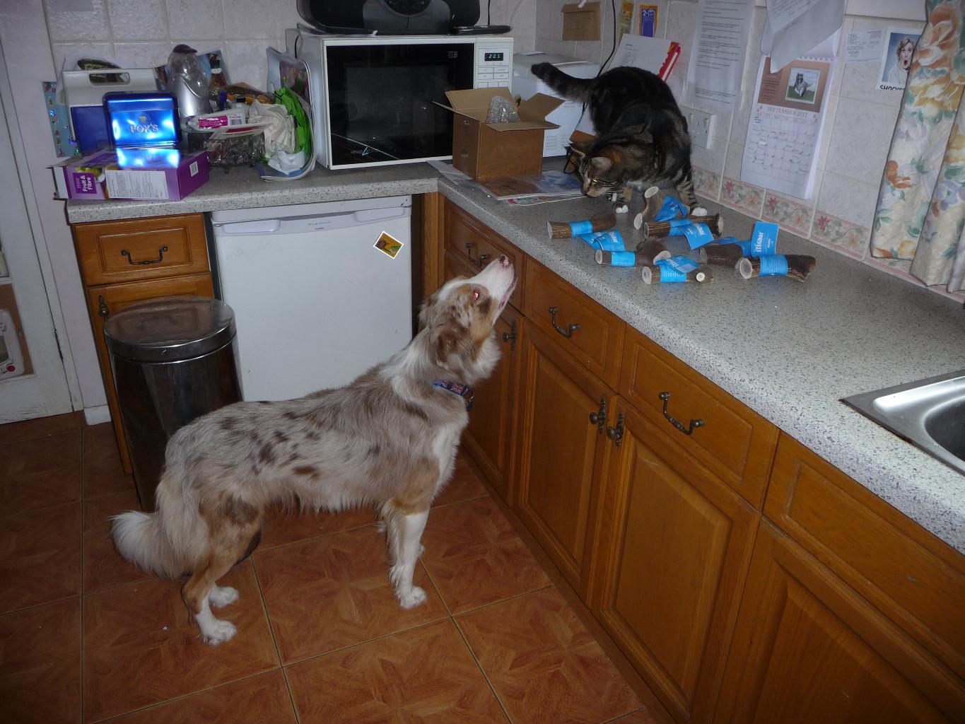 Leo checks out the Stagbars - dog chews made from stag antlers - while Rusty sniffs with interest.
