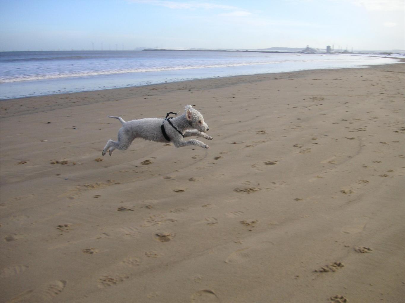 Bella the blind Bedlington Terrier has fun at the beach with new owner Lindsey Claydon.