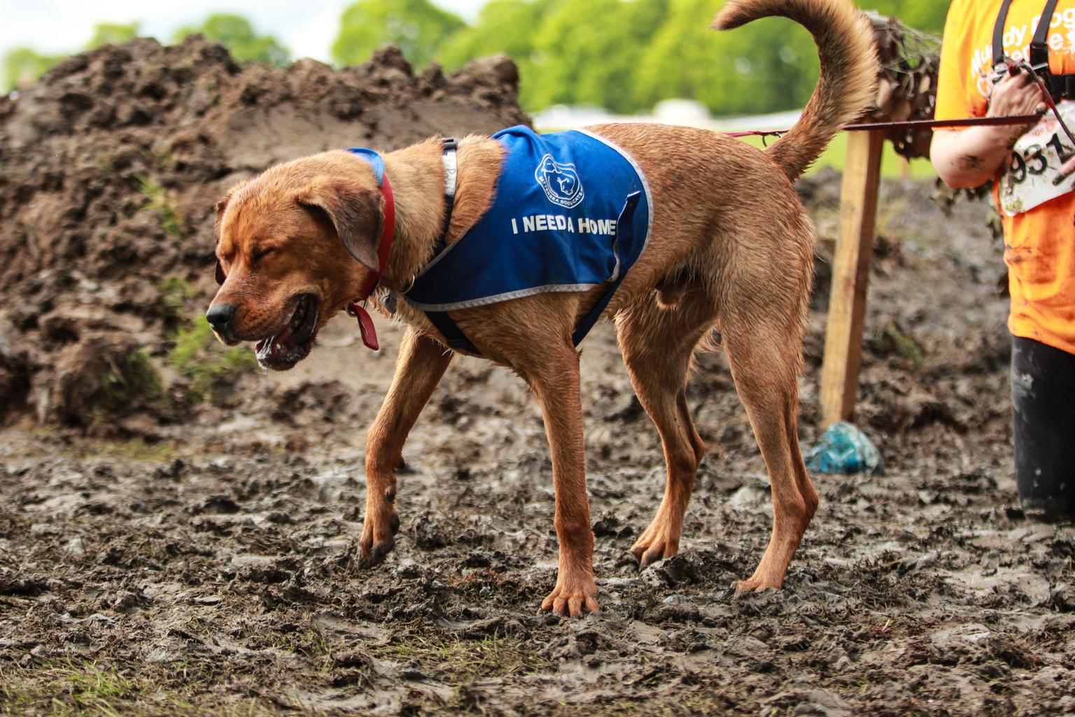 Battersea Dog Rex enjoying the muddy obstacles. Rex is looking for a home.
