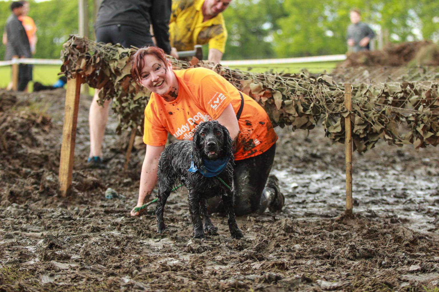Runner and dog army crawl through mud on the Muddy Dog Challenge.