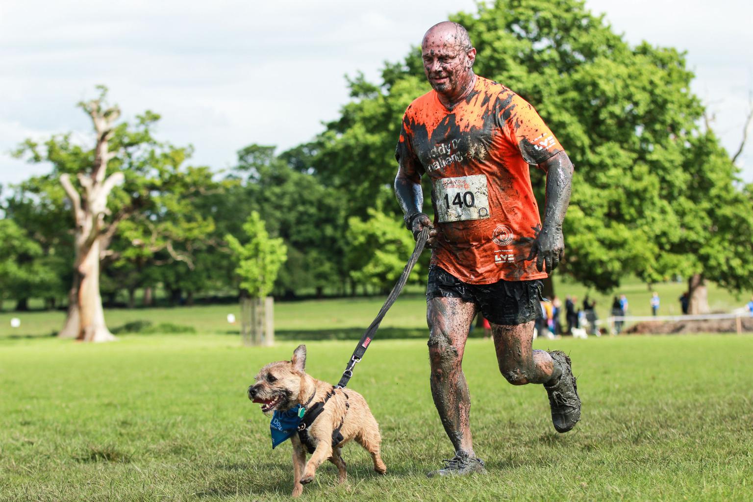 Runner and dog jogging to the finish line.