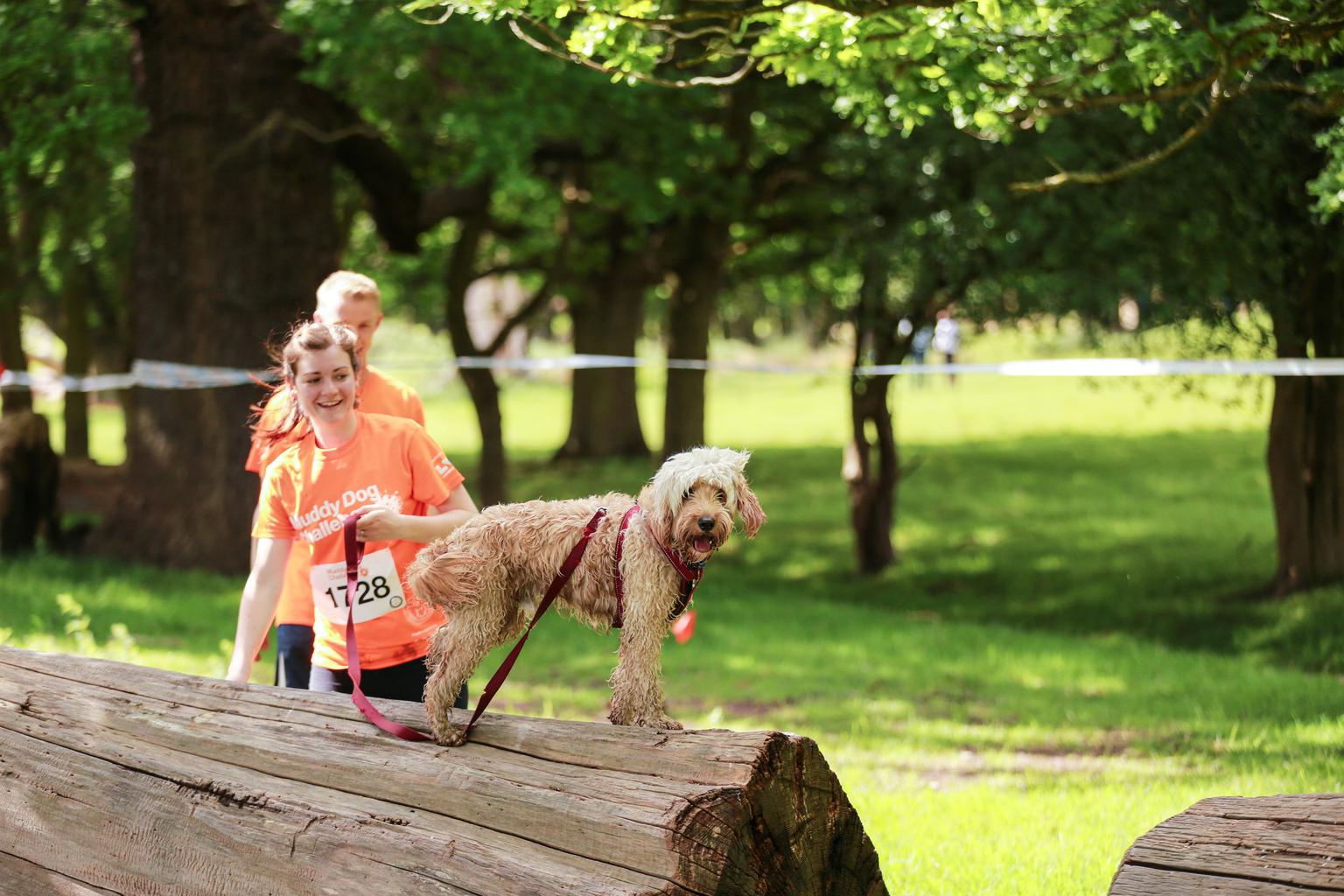 Runners and dog take on the log obstacle.