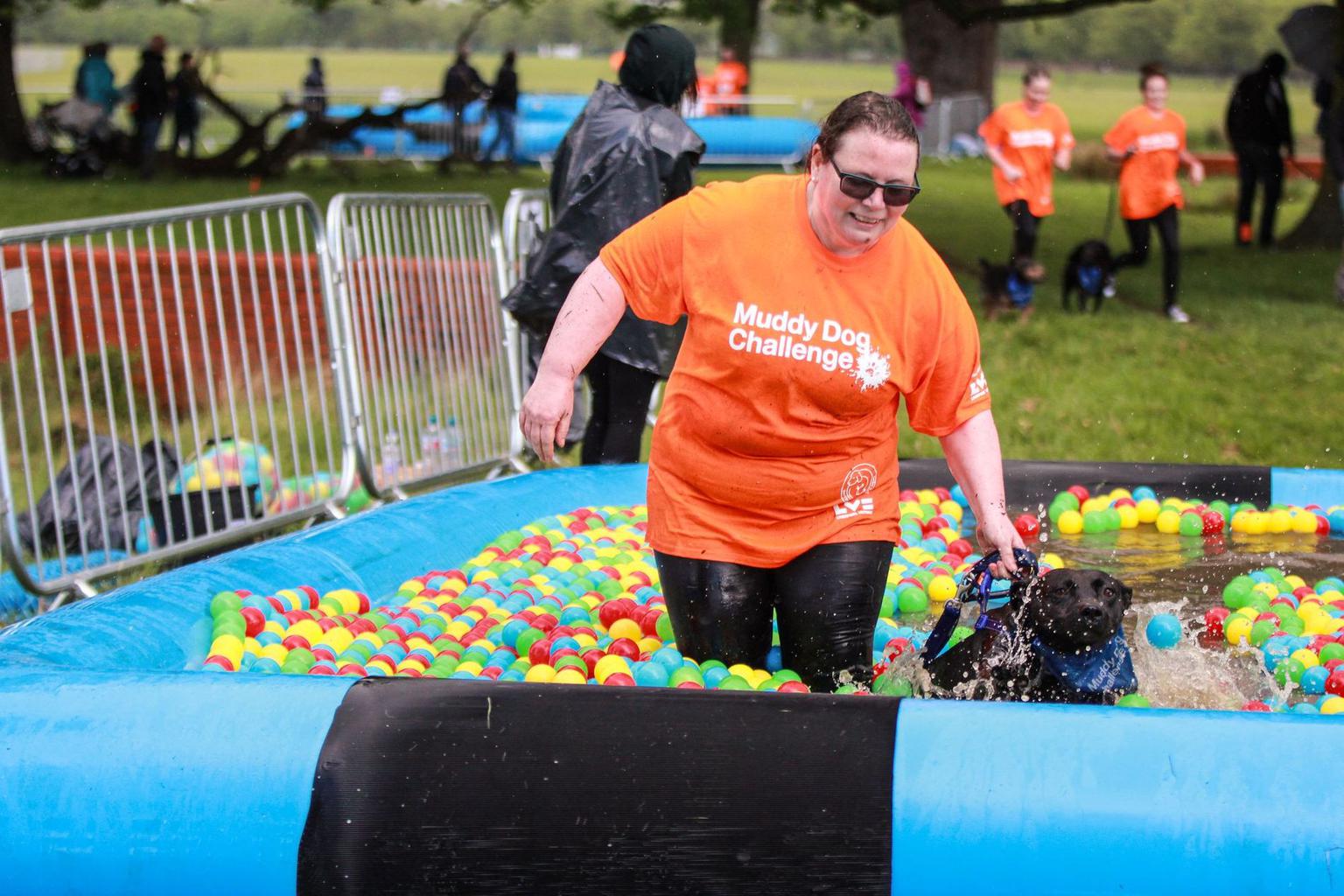 Joanna Scanlan and Millie taking on the Battersea Dogs & Cats Home Muddy Dog Challenge course.