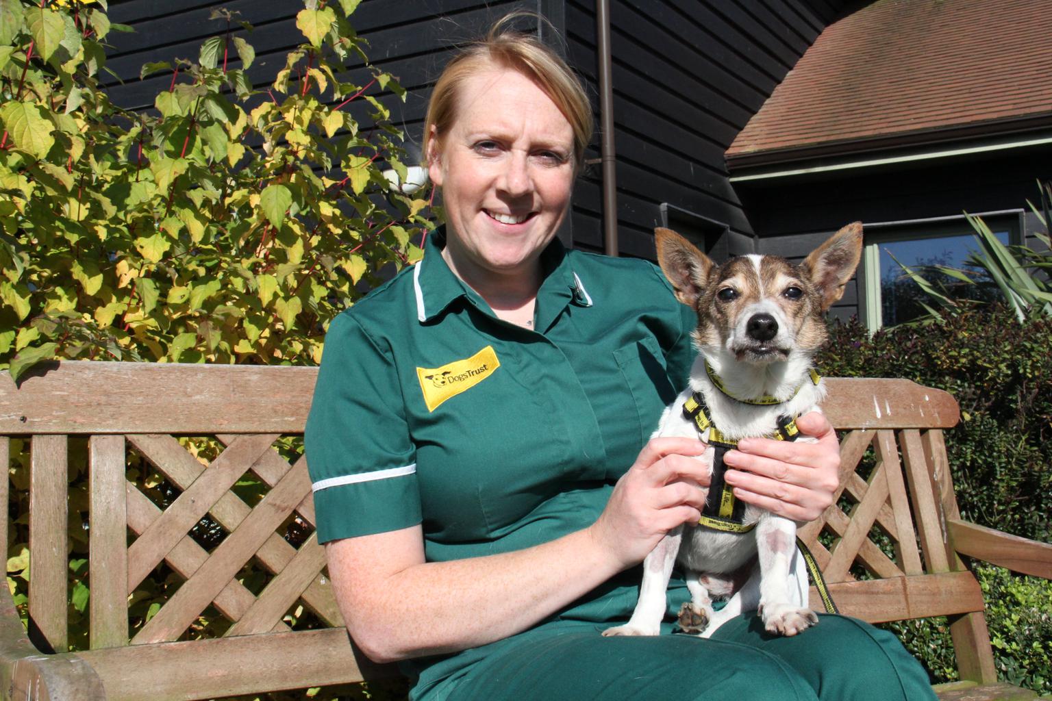 Dogs Trust veterinary nurse, Sue Thomas, is foestering Bobby while he waits for his forever home.