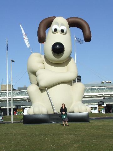 Julie of DogCast Radio with a huge inflatable of Gromit.