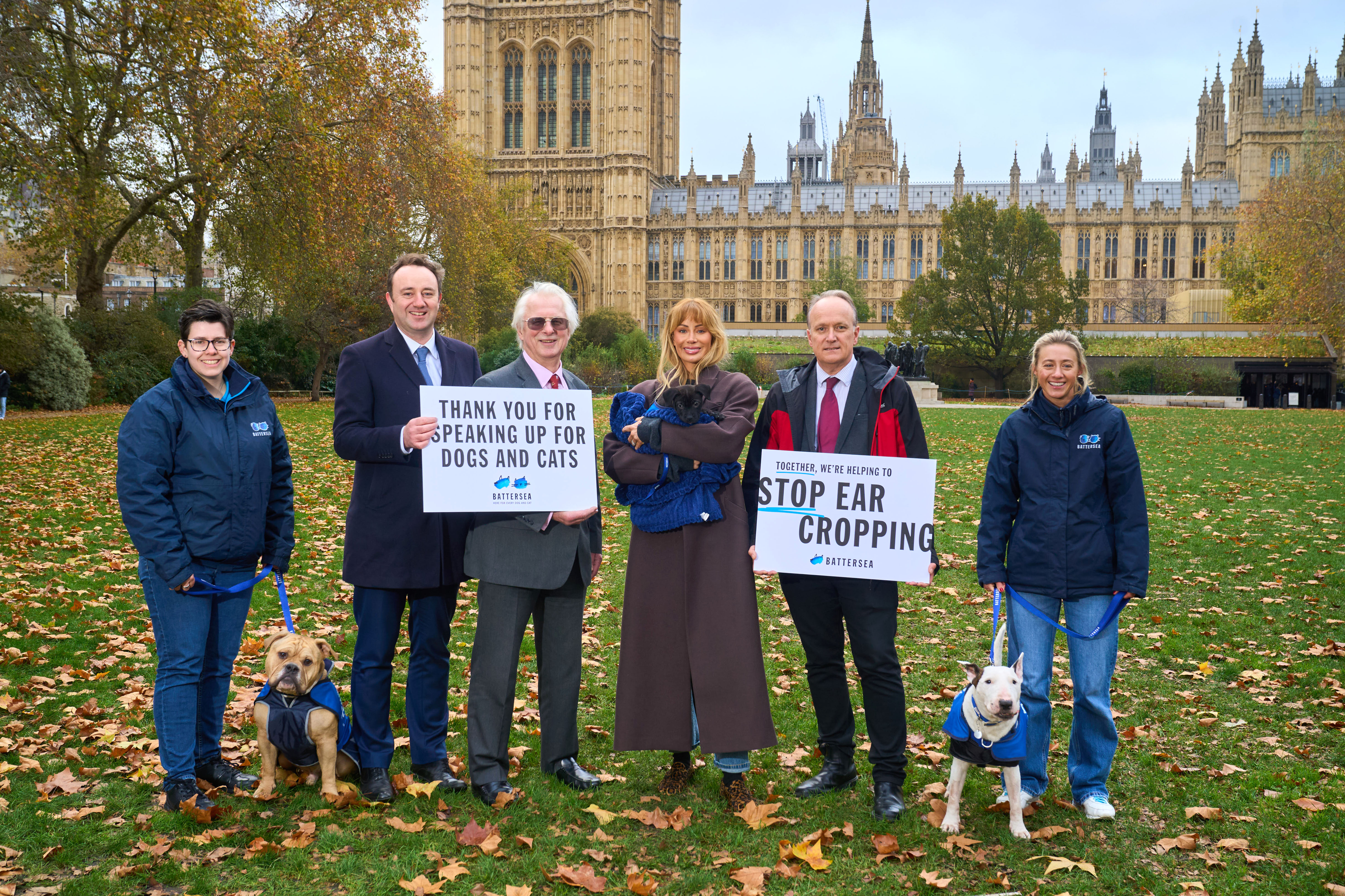 Television personality and animal rights advocate join animal welfare charity, Battersea, outside the Houses of Parliament in London to celebrate ahead of the of Animal Welfare (Import of Dogs, Cats and Ferrets) Bill pass.