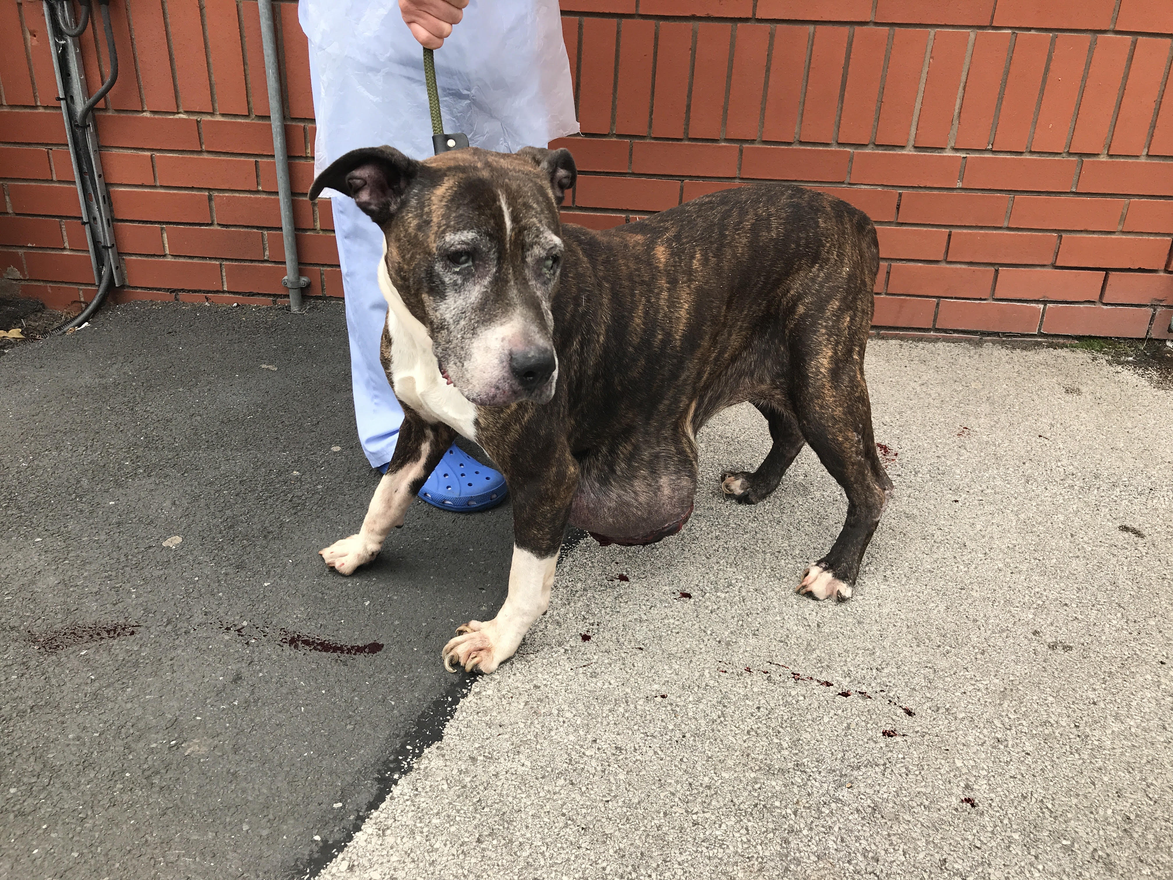 The RSPCA is appealing for information after a stray Staffie cross was found in a shocking state in Bolton