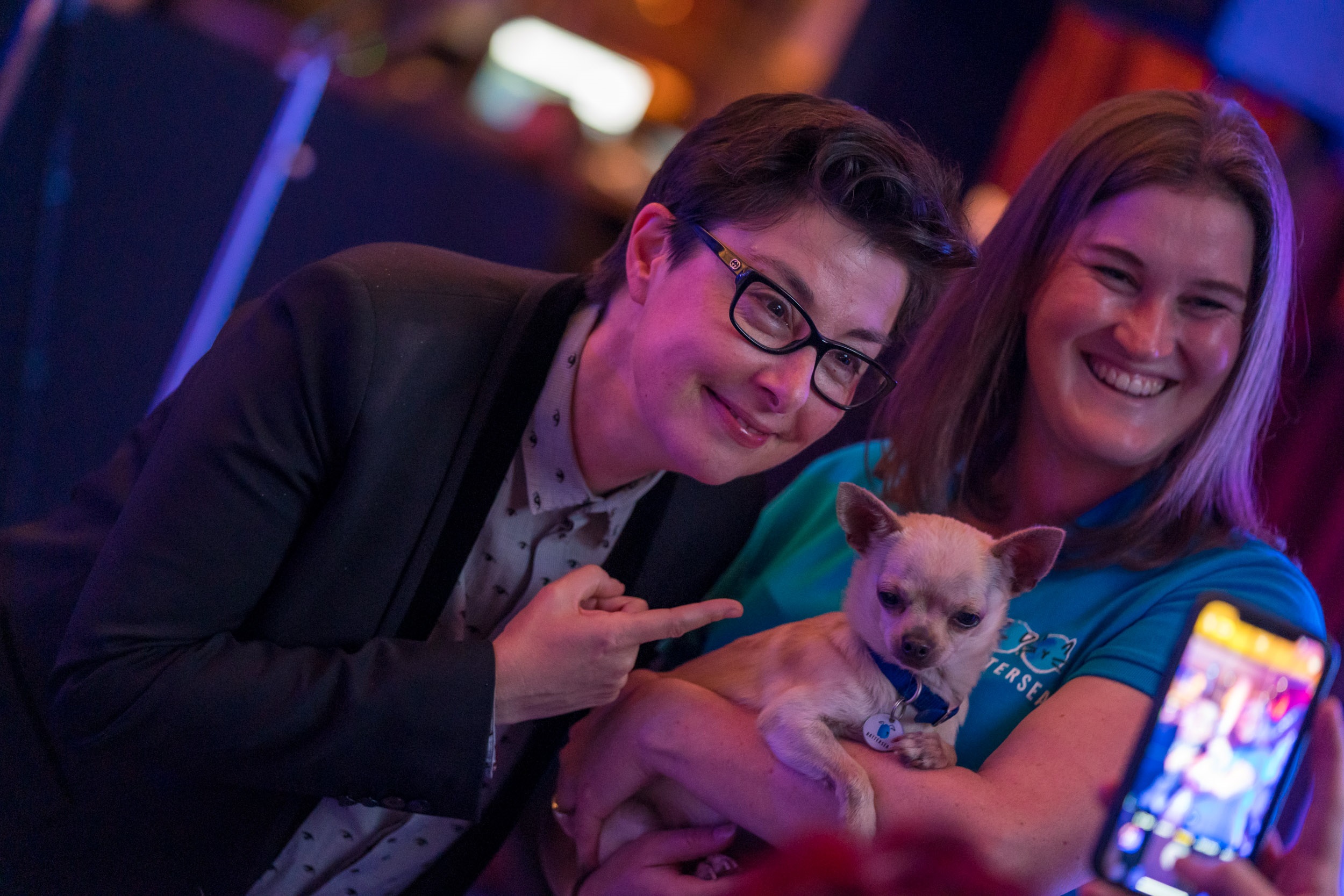 Sue Perkins and Matilda the Chihuahua at Battersea Backstage.