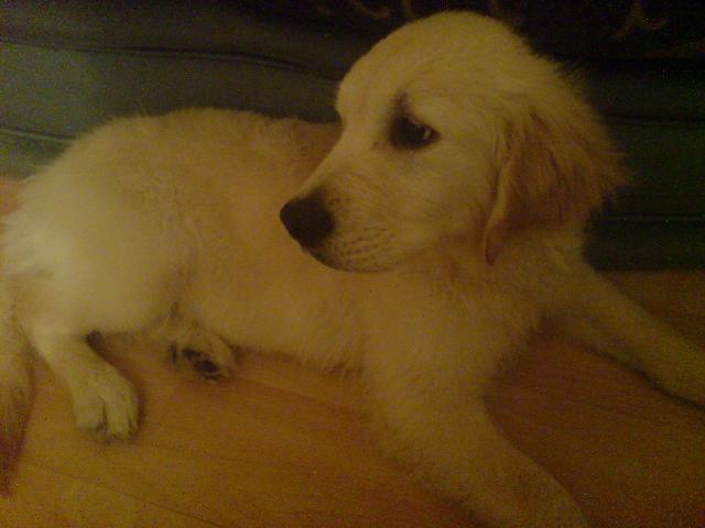This is my 5 month old pup Bailey. He has already learnt to sit, stay, fetch, roll over, lie down and to give his paw on command! He has a lovely temper and gets on well with other puppies and dogs. He isnt fazed by cats at all, result!