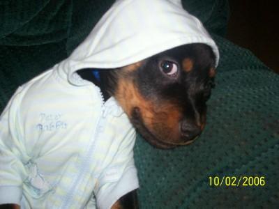 Ever see a rottie all dressed up? Rambo LOVED to wear clothes as a small puppy, I do believe he was 8-9wks in this photo. He is now a year old and the biggest loving teddy bear I could have ever asked for!