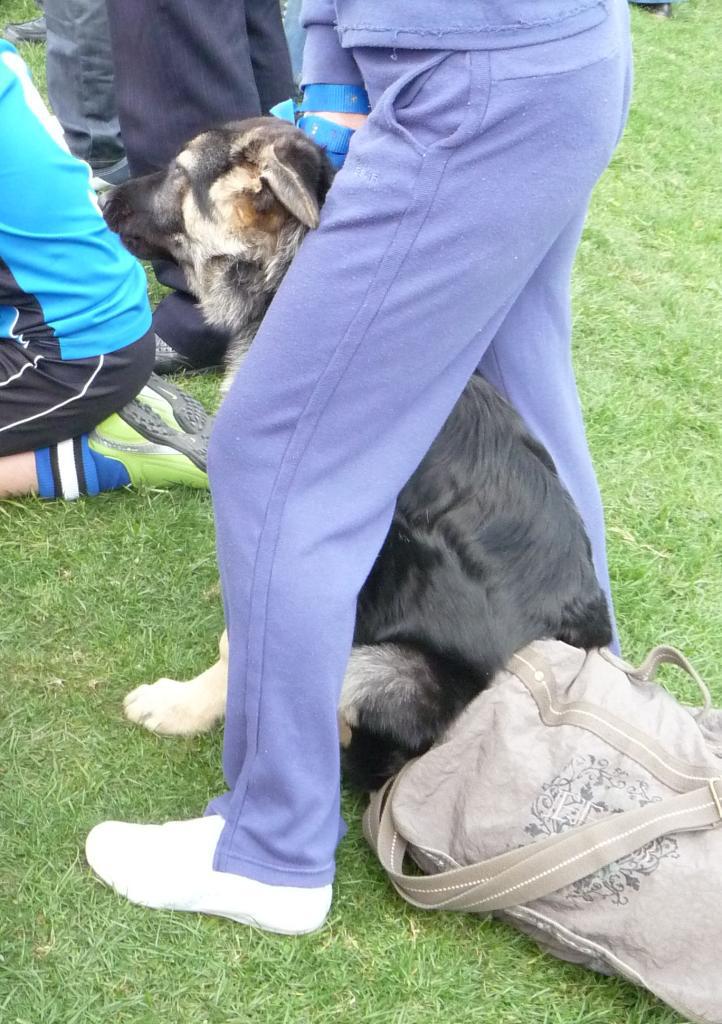 This German Shepherd feels safe sheltering between his "Mum's" legs.