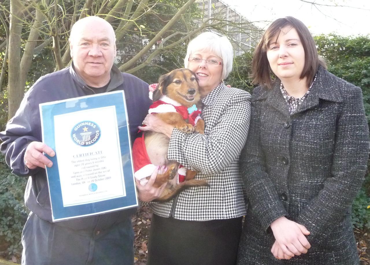 Otto the oldest dog in the world with his owners Lynn and Peter Jones and his groomer. (Pictured in December 2009)