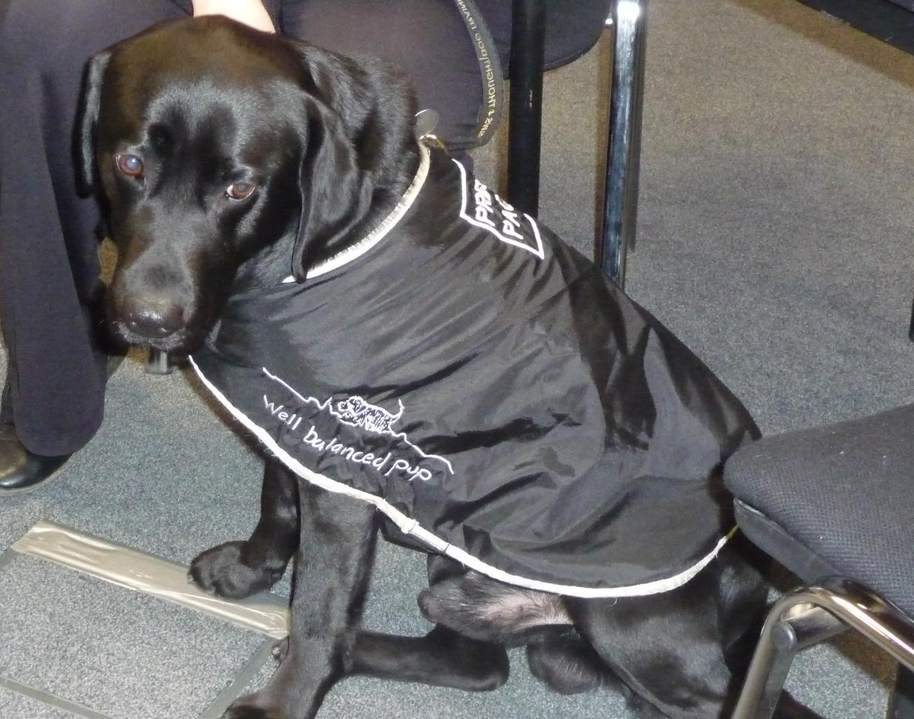 Buddy dressed to report on Crufts for Well Balanced Pup.