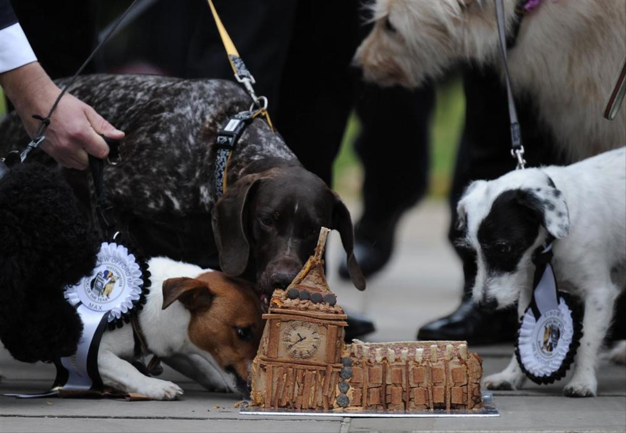 Contestants tucking into cake at Westminster Dog of the Year