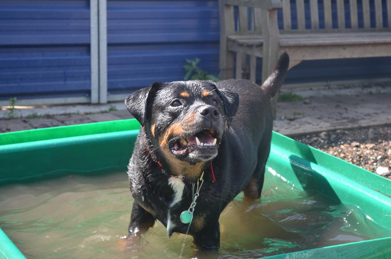 Max the Rottweiler enjoying a cool down in a pool at Battersea.